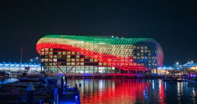 Yas Island Lights Up In Kuwaiti Flag Colors To Celebrate UAE-Kuwait Unity Week